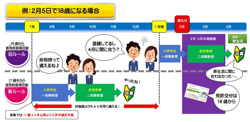 新制度からは、わざわざ混雑期の2月、3月に通わざるを得なかった早生まれの方も、それを避けて早めに教習がスタートできるようになりました!